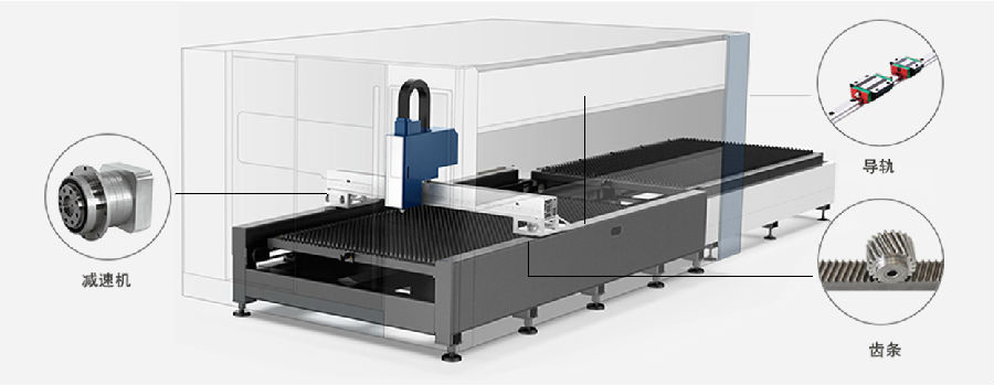 光纖激光切割機配備臺灣yyc齒條,日本新寶法蘭輸出減速機、臺灣上銀導軌。